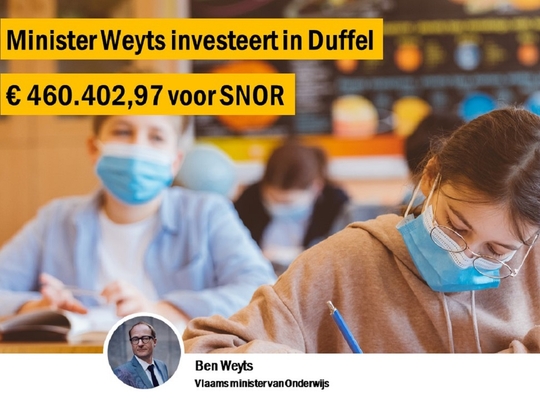Vlaams minister van Onderwijs Ben Weyts investeert € 460.402,97 in het Sint-Norbertinus Instituut (SNOR) in Duffel. “We timmeren verder aan een betere onderwijskwaliteit voor onze leerlingen”, zegt Weyts. “Die onderwijskwaliteit krikken we mee op door te investeren in onze schoolinfrastructuur.”